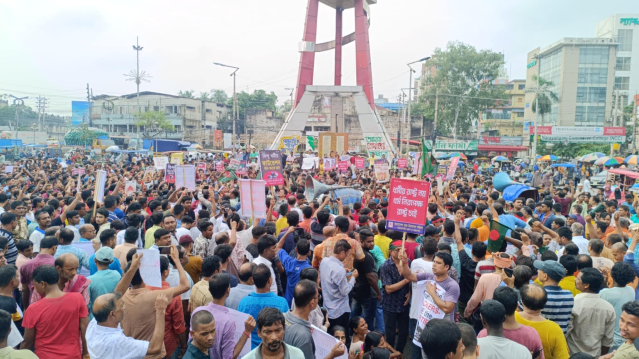 দেশব্যাপী সনাতনীদের উপর সংগঠিত হত্যা, নির্যাতন, মন্দির ভাঙচুর, অগ্নিসংযোগ ও বাড়ীঘরে লুটপাটের প্রতিবাদে ও ৮ দফা দাবিতে নারায়ণগঞ্জ জেলা ও মহানগর পূজা উদযাপন পরিষদ, জেলা ও মহানগর হিন্দু বৌদ্ধ খ্রিষ্টানর ঐক্য পরিষদ এবং সর্বস্তরের সনাতনী সম্প্রদায়ের উদ্যোগে শহরে সমাবেশ ও বিক্ষোভ মিছিল অনুষ্ঠিত হয়েছে।